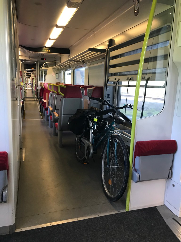Je crois que c’était plutôt une bonne idée parce que le temps était vraiment maussade ce matin-là. J’ai vu que je n’étais pas la seule à « tricher », car nous étions plusieurs cyclistes à patienter sur le quai. J’ai ainsi fait la connaissance d’une belge partie la veille et qui se rendait en Bretagne !