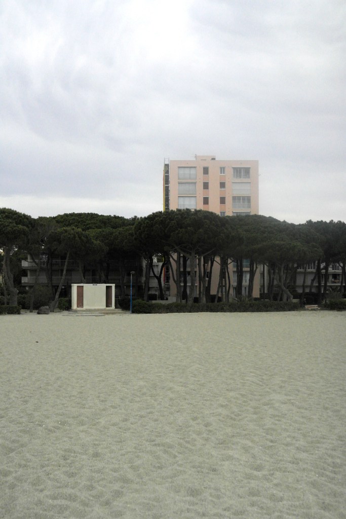 plage déserte, d'hiver, un cabanon et des parasols fixes
